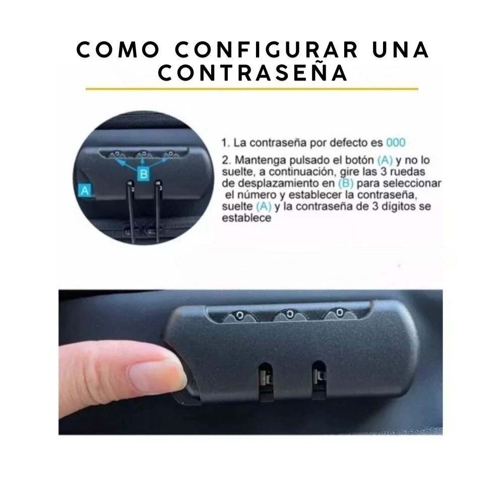 ¡Es muy fácil! La clave por defecto es 000. Para cambiarla, mantené presionado el botón de apertura, girá las ruedas para elegir tu nueva clave de 3 dígitos y luego soltá el botón. ¡Listo, tu clave personal ya está configurada!