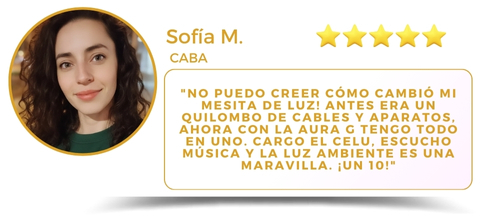 Porque la Aura G no es una lámpara, es un centro de bienestar. Estás invirtiendo en 5 dispositivos en 1: una lámpara de diseño, un parlante de calidad, un cargador inalámbrico, un despertador inteligente y una máquina de sonidos para dormir. Es diseño, tecnología y orden en una sola pieza.